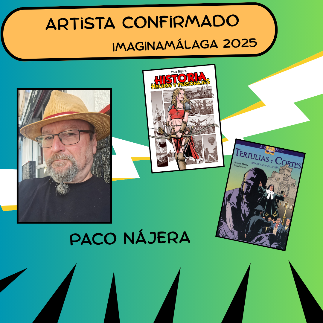 PACO NÁJERA — Autor jienense de larga trayectoria, con diversos registros gráficos. Veterano autor con una amplia comic grafía en la que aborda distintas temáticas y géneros. Desde el humor con Chungo, la parodia con Gañan o El capitán Tronado, el costumbrismo critico con Iconomias sumergidas, Sword con trabajos de fantasía heroica, Hechicero, de terror, dibujante de la ultima aventura de El Capitán Trueno guionizada por Víctor Mora, cómics de autor con Retazos, histórico con